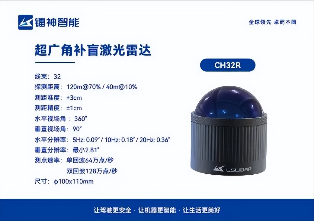“CH32R超广角补盲激光雷达”与“C32W大视场机械式激光雷达”两款补盲激光雷达,拥有广阔的视场角,可弥补主雷达在近距离低矮视野的探测盲区,辅助探测近距离低矮处的人或其他障碍物,实现更加安全更加智能的低速无人驾驶,两款产品均将在五月份正式步入量产阶段。