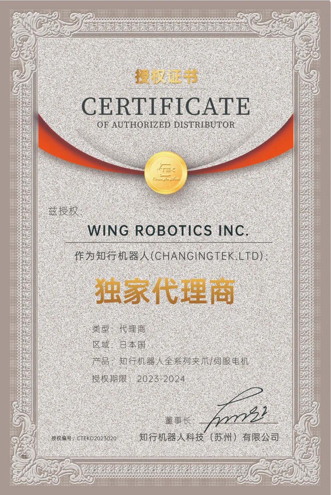 2023年,知行机器人作为国内领先的智能末端执行器产品及视觉抓取解决方案提供商,凭借自身过硬的产品质量、创新能力及技术实力,一举开拓日本市场,成功与日本知名公司Wing-Robotics达成战略合作,授权为日本地区的独家代理。