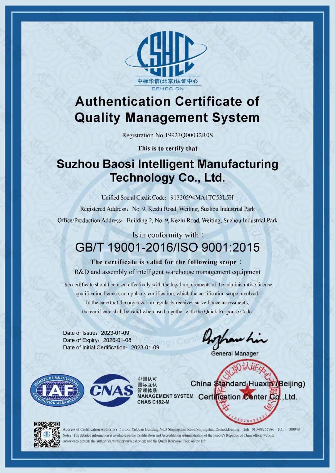 质量是企业生存的关键。ISO认证是贯穿公司质量、环境、职业健康安全管理的全面检视,是对鲍斯智能综合能力的充分认可。
