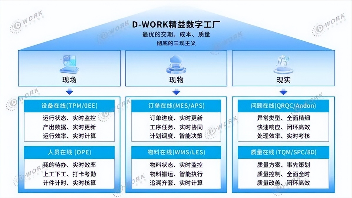 德沃克智造作为以精益思想为中心的离散制造精益数字化系统,通过“一转、双改、双模”的创新技术,聚焦现场、现物、现实,以对象为驱动,实现手(机械手)、腿(AGV)智能协同作战,帮助离散制造业破解小批量、多品种、定制化、多变更等业务模式下的管理难题,打造透明、全局、事中动态敏捷控制的精益数字化工厂。