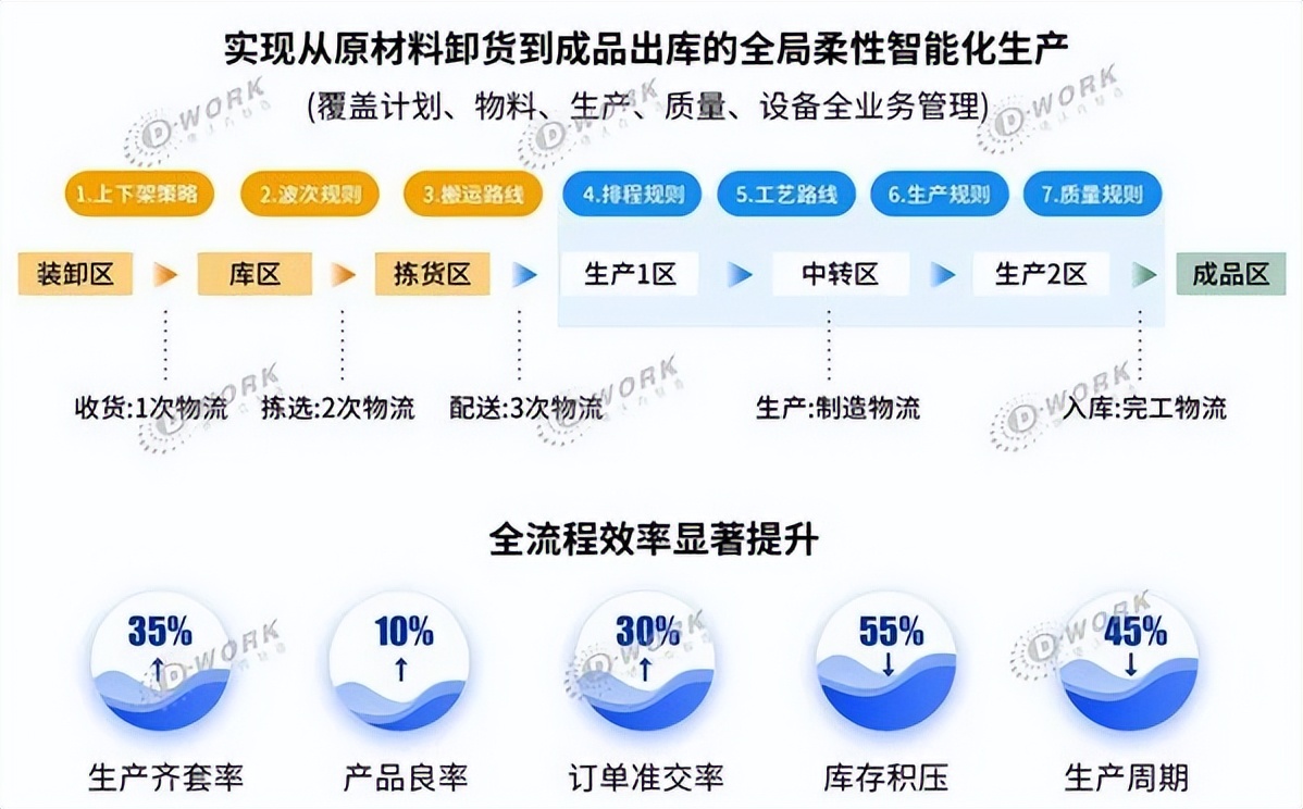 然而,实现精益数字化转型,依赖于方法论和工具,二者缺一不可。为此,中之杰结合基于十多年来深耕离散制造业的知识沉淀和经验积累,以精益Lean + Know-How + IT的融合为核心,自主研发打造了德沃克智造(D-Work),帮助离散制造业实现从原材料卸货到成品出库的全局柔性智能化生产。