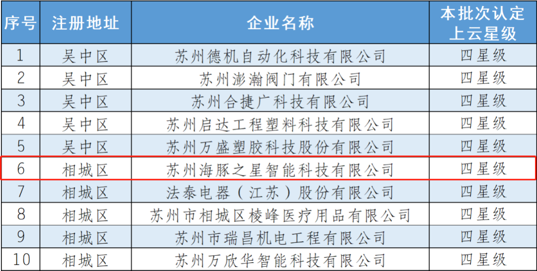 4月11日,江苏省苏州市工信局公示苏州市2023年度首批省三、四星级上云企业拟认定名单。拟认定796家企业为苏州市2023年度首批江苏省三星级上云企业,70家企业为苏州市2023年度首批江苏省四星级上云企业。苏州海豚之星智能科技有限公司被评为“江苏省四星级上云企业”。