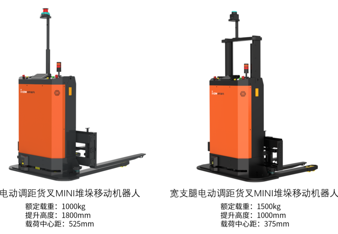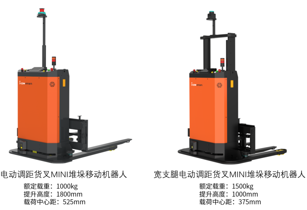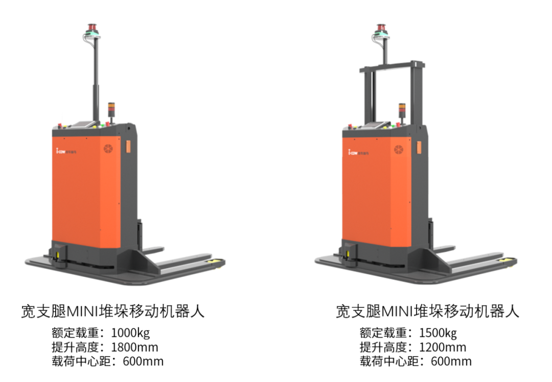 宽支腿MINI堆垛移动机器人,货叉外间距可选560/680mm两种规格,主要适用于封闭式托盘堆垛、产线对接等。