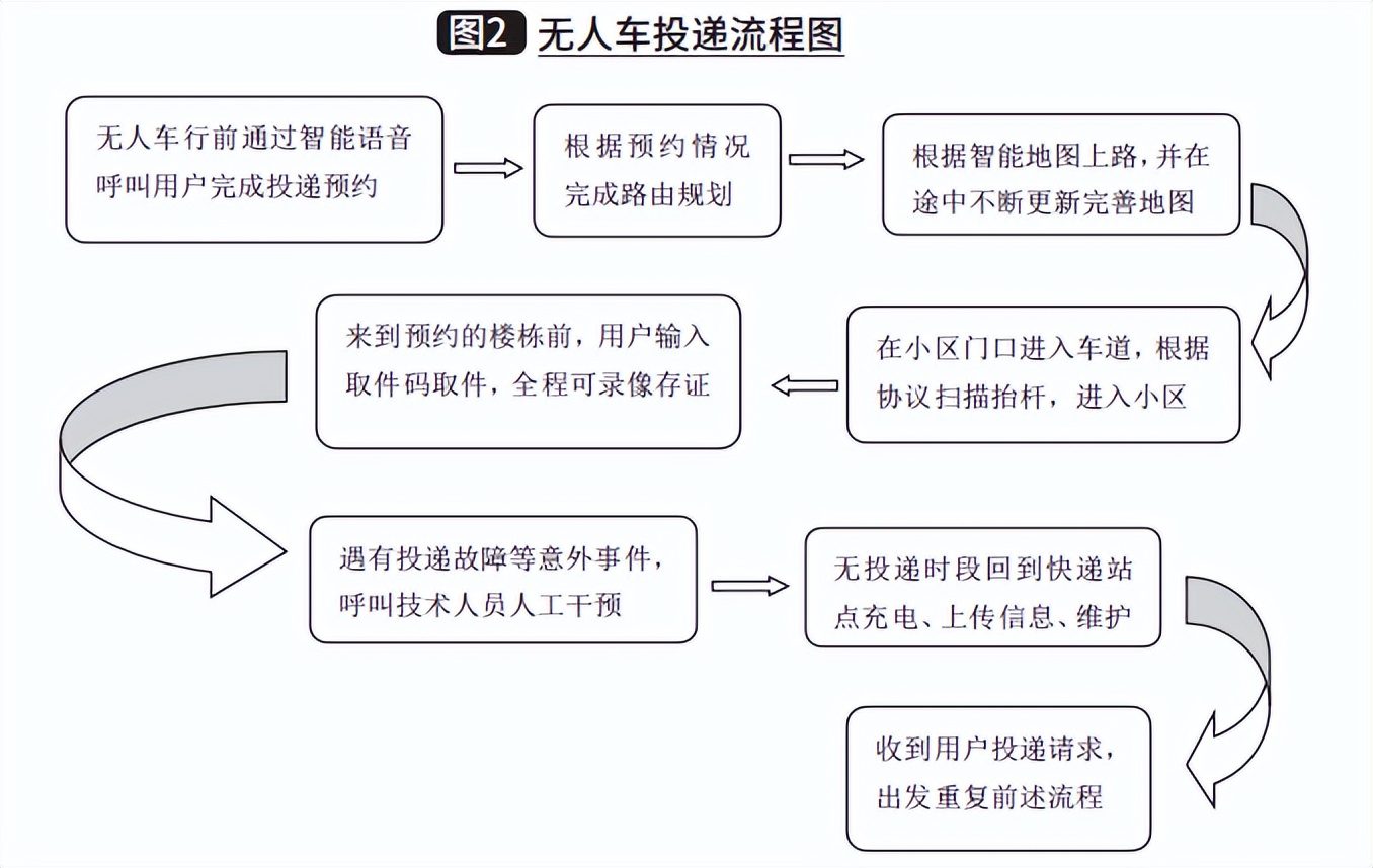 以上过程,无人车可以做到全天24小时不间断满足用户的投递需求。同样,类似于智能快件箱收件,无人车也可用于揽收快件,提供比智能快件箱更机动、更灵活的服务。无人车运作流程具体示例,见图1、图2。