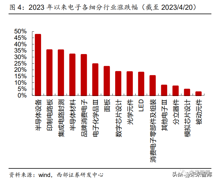 具体来看,今年以来半导体设备和材料、PCB、封测板块涨幅靠前。市场对今年晶圆厂资 本开支悲观预期有所修复,同时国产替代进入加速期,在相关公司订单、业绩等验证下, 半导体设备和材料板块表现较好。2023 年以来 PCB 行业库存持续去化,行业景气度处于 底部,在 AI 需求带动下,服务器 PCB 相关业务的公司涨幅表现较好。封测行业由于周期 相对靠前,在下游需求复苏预期下,有望率先迎来拐点,今年以来封测板块也表现较好。今年以来(截至 2023年4月 20 日),电子行业涨幅居前的个股分别为:佰维存储(502.9%)、 寒武纪(387.8%)、源杰科技(145.5%)等,涨幅靠后的个股分别为传艺科技(-38.5%)、联建光电(-35.7%)、激智科技(-34.9%)等。