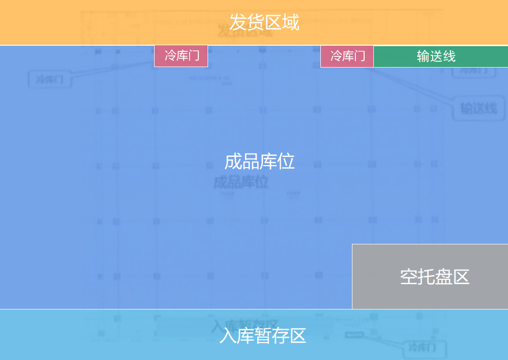 项目区域包含发货区域、成品库位和入库暂存区,共3道冷库进出门,1道用于成品生产入库,2道用于成品发货出库。
