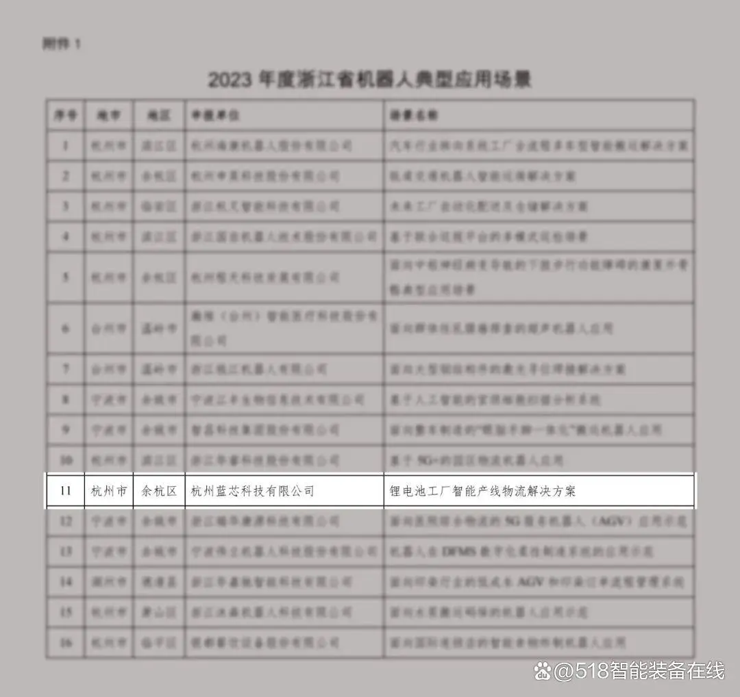 近日,2023年度浙江省机器人典型应用场景和“机器人+”应用标杆企业名单完成公示。蓝芯科技《锂电池工厂智能产线物流解决方案》入选机器人典型应用场景。