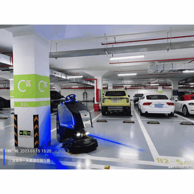 Scrubber 75 机身融合了激光雷达、毫米波雷达、深度摄像头、电子防撞条等多个传感器,车库会车情况下智能灵活避障,安全可靠。执行清洁作业的同时,动态检测车位情况,及时清洁空车位。