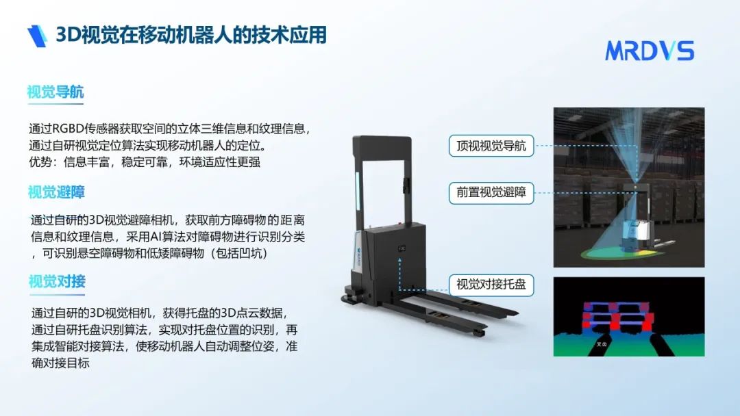 迈尔微视(MRDVS)基于海量场景数据,对移动机器人3D视觉传感器持续迭代(包括感知算法和传感器硬件),为商业、工业移动机器人提供3D视觉+AI 的软硬件一体解决方案,实现机器人视觉导航、视觉避障、视觉对接、视觉抓取功能。