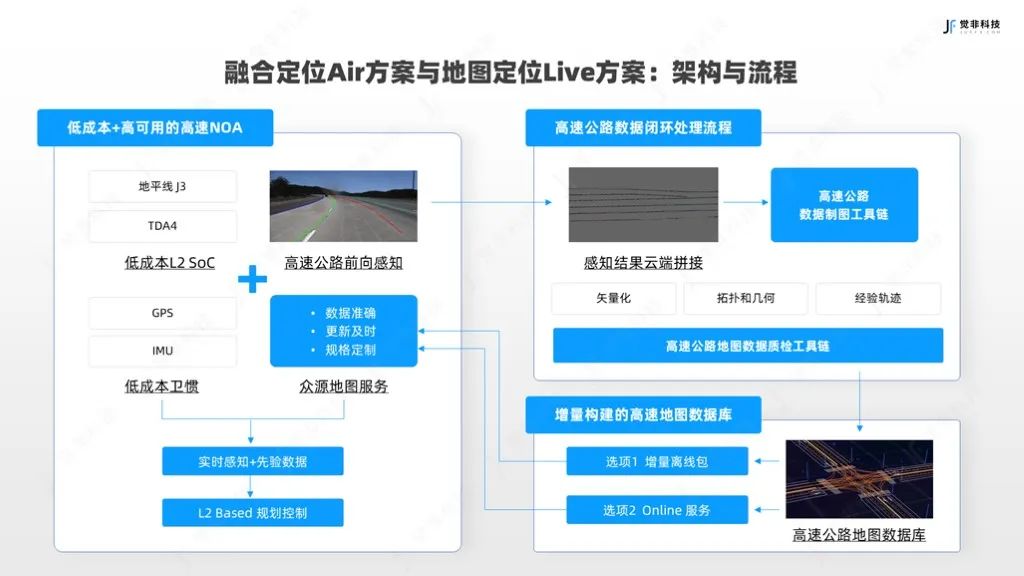在这套量产架构的支撑下,觉非同时推出了面向高速NOA的地图定位量产方案。方案通过车机导航地图或众源地图,结合量产车实时感知结果,可满足车辆在高速场景下的高精定位需求。