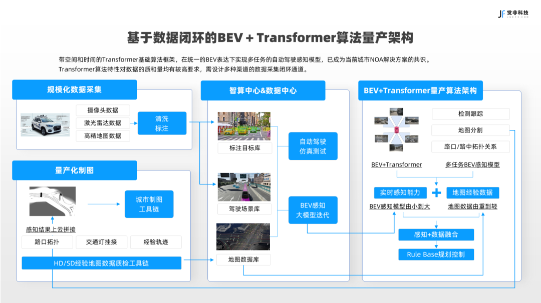近期觉非也推出了BEV+Transformer算法量产架构。这套量产架构通过规模化数据采集,生成冷启动模型,而后通过量产化制图能力产生地图数据库,结合觉非自研的数据中心实现快速不断的迭代,供给生成BEV+Transformer的算法训练数据,进而实现大模型的正向循环。