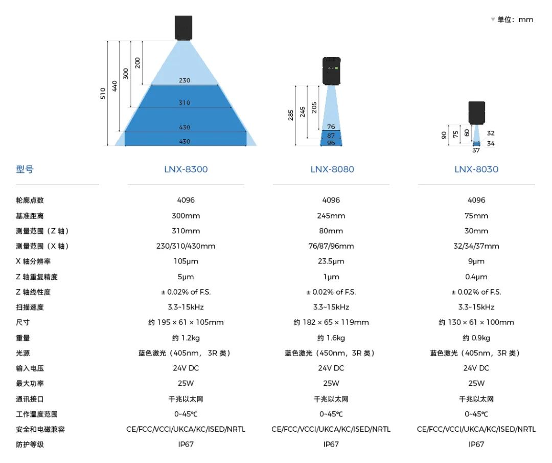 微米级精度:子型号Mech-Eye LNX-8030 X轴分辨率最高可达9µm,Z轴重复测量精度最高可达0.4µm,细致入微地呈现各类微小特征。
