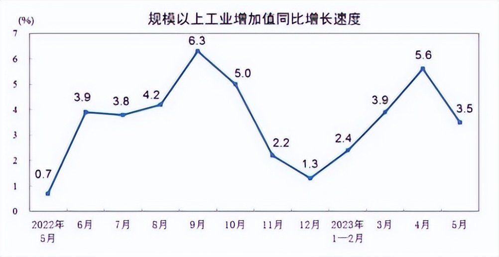 5月份,规模以上工业增加值同比实际增长3.5%(增加值增速均为扣除价格因素的实际增长率)。从环比看,5月份,规模以上工业增加值比上月增长0.63%。1—5月份,规模以上工业增加值同比增长3.6%
