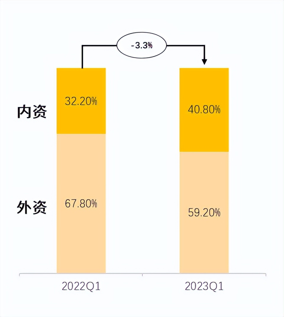 2023年一季度,工业机器人内资市场份额首次突破达到40.8%,相对应外资市场份额则首次跌至59.2%。
