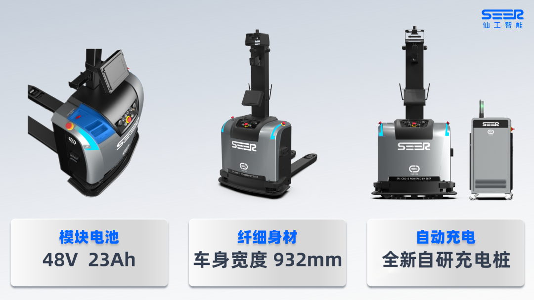 目前仙工智能已完成该款地面式叉车从性能至外观的全方位升级,新款地面式智能叉车 SFL-CBD15 结合以往车体的长期验证做了多项改进,外形小巧宽度仅 932mm,负载能力超强达1.5T,运行效率大幅提升,最大可达到 2m/s 的运行速度,对比老款提速 100%。