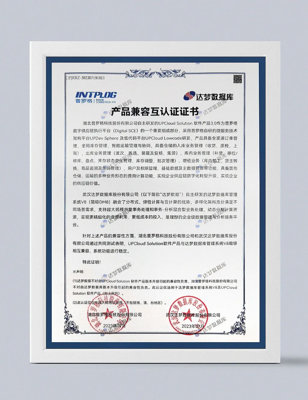 普罗格通过DM8的兼容互认,取得产品兼容互认证书,表明普罗格自主研发的UPCloud Solution 3.0产品具有软硬件解耦、应用优化、支持混合业务负载等特点,可提供高性能、高价值的数智化供应链服务,为多业务类型企业提供供应链数字化转型产品一站式服务。