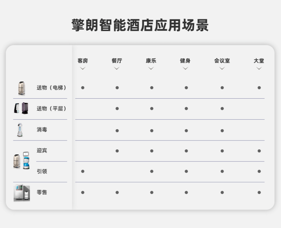 擎朗智能旗下服务机器人产品矩阵,可覆盖迎宾接待、客房送物、餐厅送餐、场所消毒、无人零售等各类酒店场景。随处可见可感的智慧化服务贯穿住客入店的各典型场景,不仅为酒店打造浓厚的智能标签,也将顾客体验提升至更高维度。
