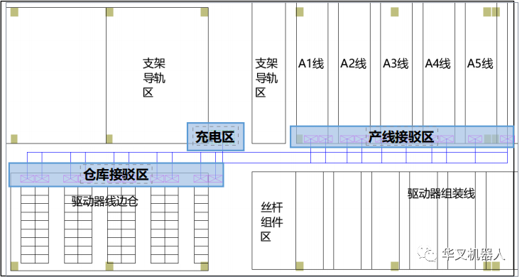 根据客户需求以及现场环境,规划每条产线设置2个接驳位,共10个接驳位;仓库接驳区共设置10个接驳位;主通道采用单通道设计,减少了AGV占道空间,有效避免通道中AGV小车与搬运车发生阻塞和碰撞的情况。
