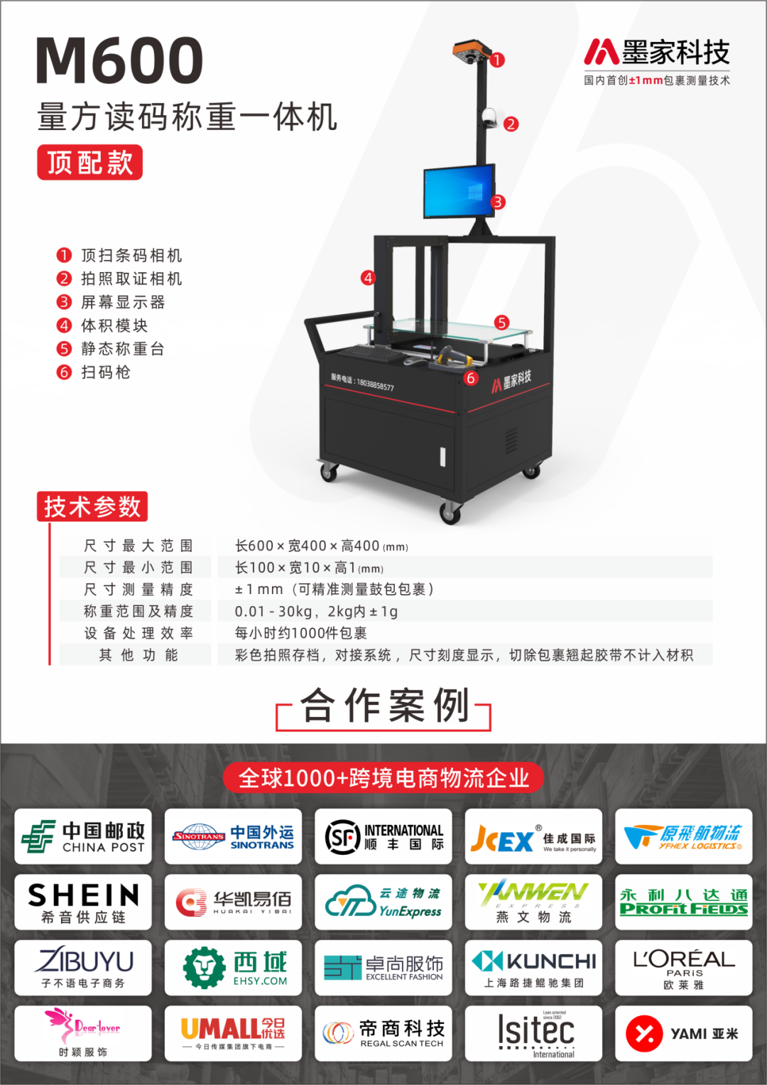 墨家科技团队根据莎莎的具体需求情况,设计了静态顶配款体积测量称重扫码一体机(M600)的DWS方案。顶配款在基础款配置上升级加装了高清扫码相机、工业取证相机、移动电源和滑轮推车,可以精准测量物体的长宽高和重量,支持自动扫码,支持对所测货物进行彩色拍照存档,支持数据系统(ERP、WMS等)对接;另外,还可以轻松移动设备,在仓储中心进行推动穿梭。在尺寸测量方面,得益于墨家科技自研技术,测量精度高达±1mm,支持规则/不规则物品测量。在称重方面,精度±1g。处理效率可达1000个包裹/小时,对比人工作业方式,大幅提高了商品数据采集的准确性和效率。