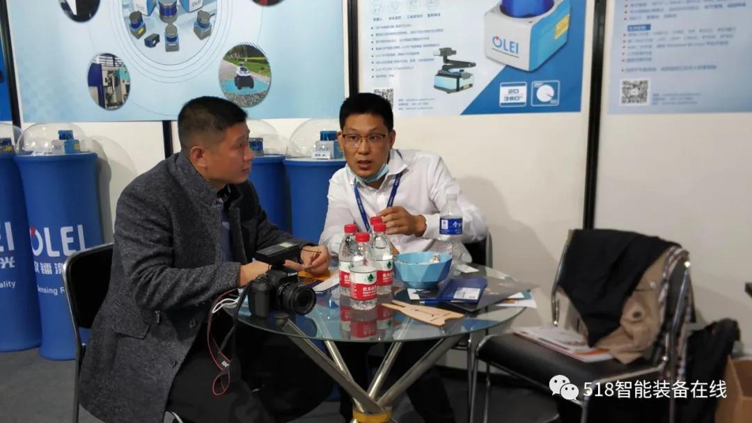 欧镭激光副总涂清松(右)向518智能装备在线记者郝瑞交流