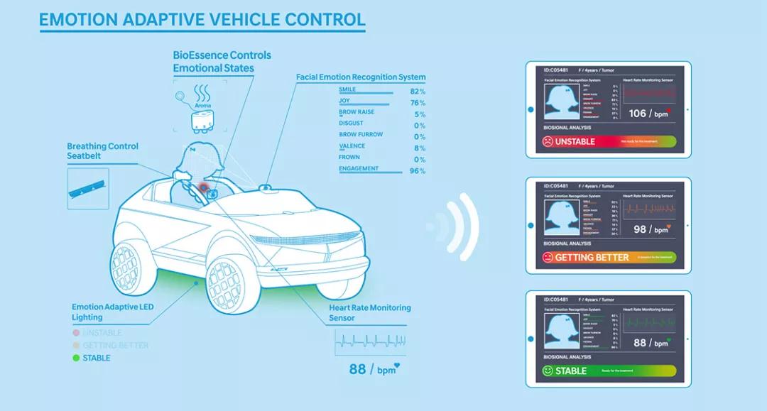 为了提高道路安全与乘客的乘坐体验,一些汽车制造商也越来越重视对情绪的评估。例如,现代汽车正在与麻省理工学院合作开发情绪自适应车辆控制(Emotion Adaptive Vehicle Control,EAVC)技术,可基于车辆内部和外部的信息优化车辆环境。具体来说,EAVC 可以监测车内人员的面部表情、心率和呼吸频率,并将读数与车辆的输入(速度、加速度、噪音和振动)相结合,然后利用人工智能技术对这些数据进行处理,以优化车辆环境,并主动控制车辆系统,包括照明、气候、音乐等。