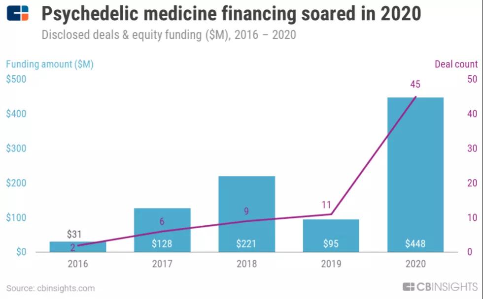 在这种情况下,2021 年,科技公司和制药公司会抓住人们对这类药物改观以及国家政策转变的机会,将这些药物推向市场。与此同时,投资者也在涌入该领域。CB Insights 的数据显示,2020 年,迷幻药物领域初创公司的融资交易数量较 2019 年增长了 4 倍,交易金额增长了近 400%,达到 4.48 亿美元。