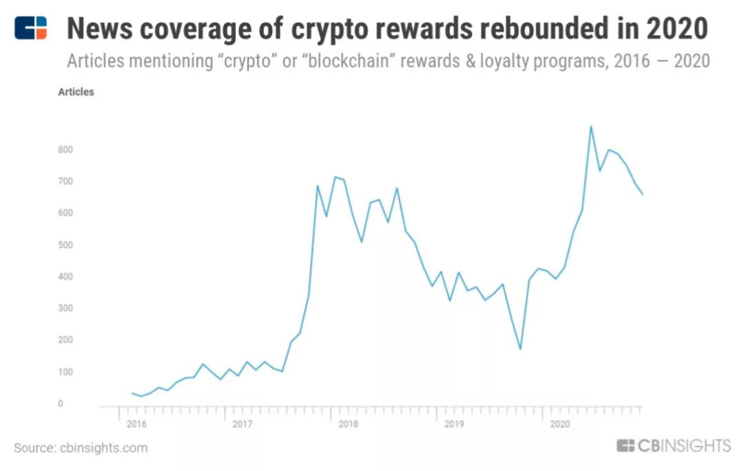 图 | 2020 年关于加密货币作为奖励的新闻报道数量(来源:CB Insights)