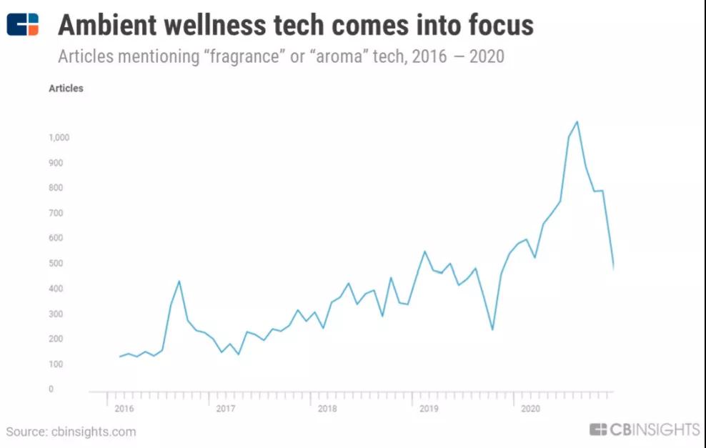疫情期间,很多消费者都通过香薰来减缓压力,进行自我保健,所以媒体对香水及相关技术的关注呈现出稳步上升趋势。CB Insights 的数据显示,全球香料和香水市场规模可达 528 亿美元。
