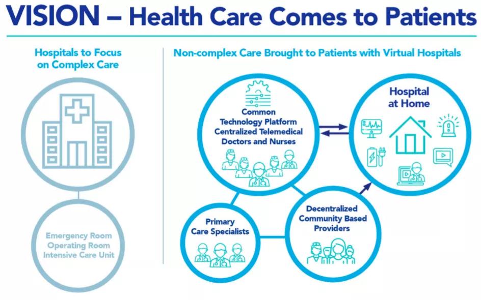 远程医疗的局限性也对家庭医疗的监控级别提出了更高的要求,这也是居家医院(hospital-at-home )出现的原因。居家医院的目的是为病人在家中提供医院级别的护理。尽管病人不在医院,但他们可以通过虚拟探视、数字沟通和远程生物识别监测技术与其护理团队保持密切的联系。