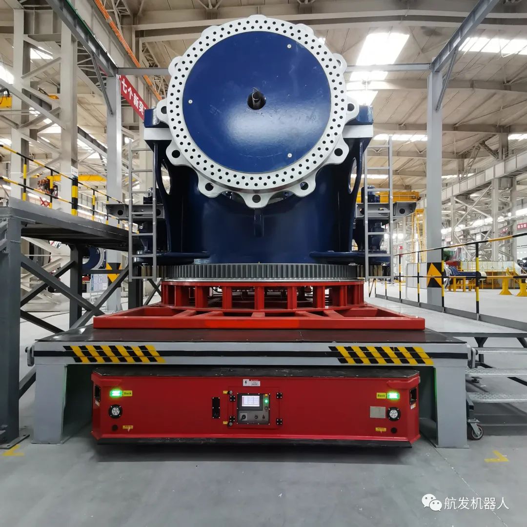 据悉,中车新能源装备产业园项目,是松原建市以来最大的单体产业项目,也是中国中车多极化发展的重大产业布局。该产业园由总装厂房、电机厂房、储能厂房、叶片厂房组成,涵盖中车风电全产业链,是一个规模化、集约化、标准化的智慧、零碳、生态集群创新示范基地。产业园1期具备年产400台套风电整机、叶片、发电机、塔筒、变桨系统、储能系统的生产制造能力。(以上摘自公众号:中国中车)项目情况此次项目,航发机器人为中车吉林风电提供了6台OmniTitan系列遥控全向轮式运输车(AGV),主要用于重量承载范围从20T-150T不等的风电机组整机、轮毂及其装配用大吨位零部件,在车间内自动化产线各工位和车间外堆场间的运输搬运作业。