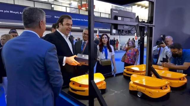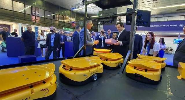 而在此展出的立镖小黄人,更是以其出色的工作能力、可爱的外形,以及希腊邮政和希腊政府数字化转型的代表案例身份,吸引了一同前来的希腊领导人们驻足合影。尤其在亲身试验投递分拣后,希腊国家与数字化部长基里亚科斯对小黄人的工作效率及精确度大加赞赏。
