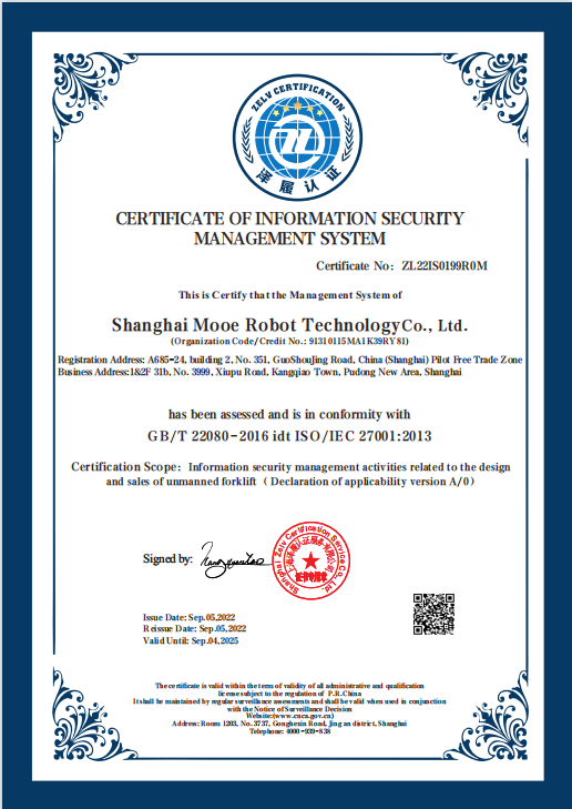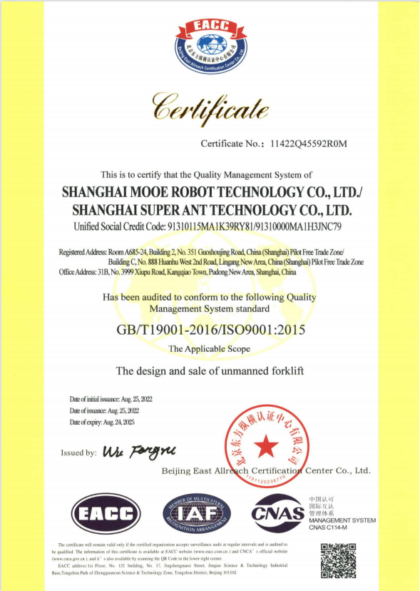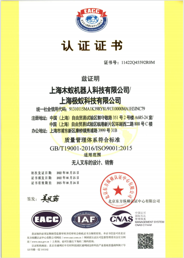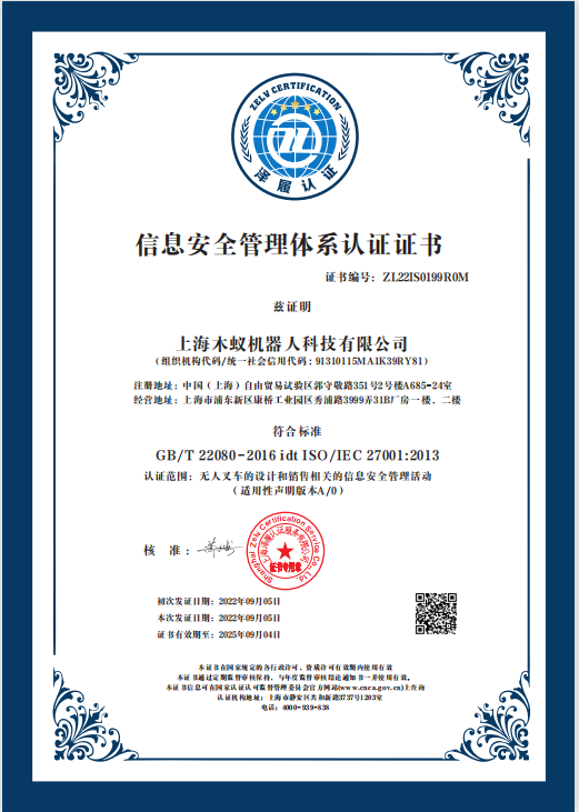 行而不辍,则未来可期。未来,在ISO9001质量管理体系及ISO27001信息安全管理双重体系的支持下,木蚁机器人将不断加强信息安全、数据保护和数字化体系建设,为客户提供值得信赖的无人驾驶智能搬运解决方案,为推动更多行业数字化、智能化转型赋能。