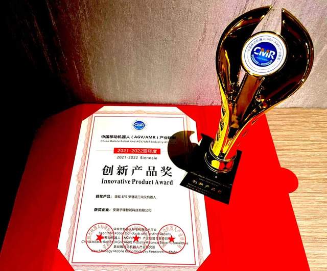 在当天的颁奖典礼中,安徽宇锋智能科技有限公司重载EPS窄巷道三向叉机器人凭借深厚的技术功底、创新的技术产品收获行业专家学者和终端用户们的肯定,荣膺“2021-2022双年度创新产品奖”。此次奖项的授予,也是对宇锋智能品牌在移动机器人行业影响力和技术创新实力的认可。