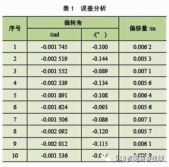 4 结论及误差分析如表1 所示,通过10 次成功标定数据比较,最大偏转角误差的绝对值控制在0.04°,最大偏移量误差的绝对值控制在0.001 m。