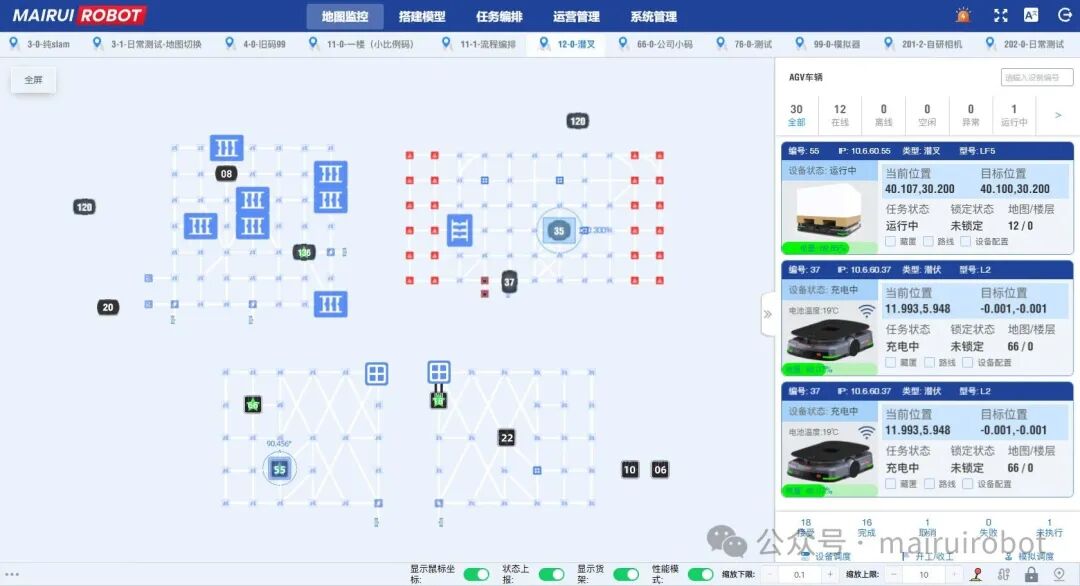 迈睿机器人自主研发的机器人调度系统RCS,仓储管理系统IWMS解决方案可与企业现有MES、WMS、ERP等系统无缝对接,实现数据互通与智能调度。其分布式算法支持数百台AMR高效协同,通过实时任务分配与动态路径规划,最大化整体物流效率。此外,系统具备故障秒级响应能力,确保异常情况下生产节拍不受影响,保障产线持续稳定运行。
