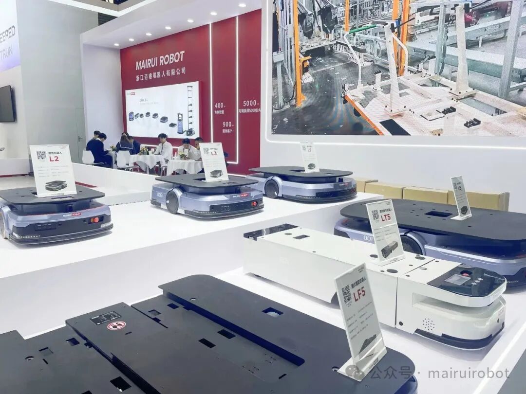 展台核心区域的实景动态演示区,成为现场最具人气的互动焦点。多款迈睿明星AMR产品——包括灵活敏捷的潜伏顶升机器人、负载强劲的重载型潜伏叉取AMR-LF5、以及精准高效的潜伏牵引机器人LT5——在自研调度系统的统一指挥下,协同演绎了一场行云流水的“物流芭蕾”。机器人自主导航、智能避障、精准协作,完整复现生产线全流程自动化搬运作业,其卓越的柔性适配能力、运行稳定性与多机协同效率,吸引众多专业观众驻足交流,并与技术团队展开深入探讨。