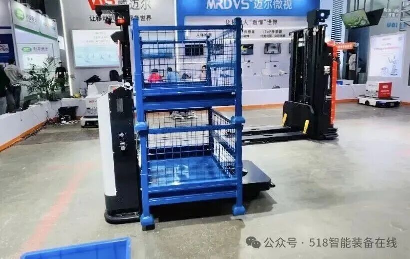 在VMR威迈尔展位现场,一款红色无人叉车正精准完成料笼双层堆叠,一旁的白色全向无人叉车随即接棒,将堆叠好的料笼平稳转运。