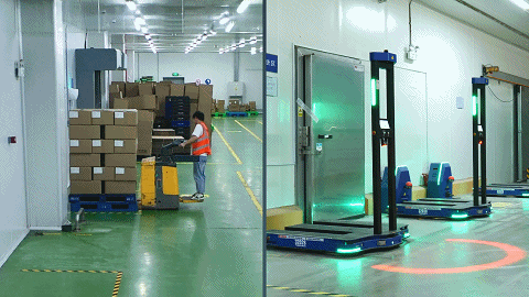 产成品区域,塔斯克机器人将冷冻品运输到冷库旁,冷库工人及时入库。