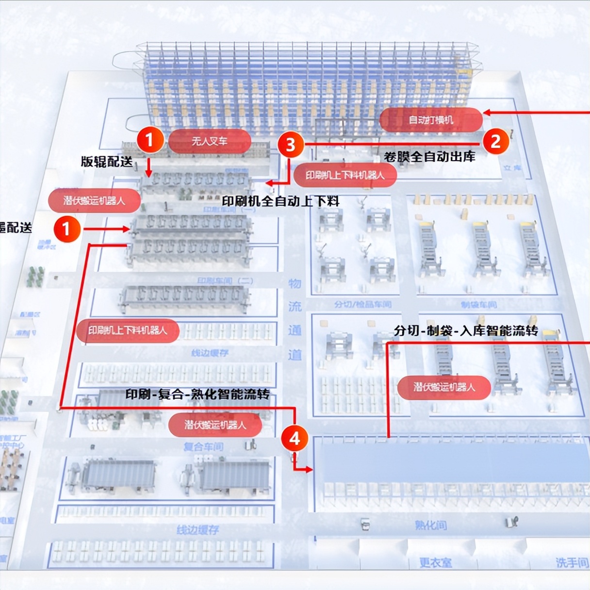 通过AMR串联原料仓库→印刷→立库→复合→熟化→分切→打包→成品库等生产区域,实现卷膜的全自动出入库、半成品周转、上下料,实现生产的全部自动化和数字化,打造江苏省包装行业首个5G智能工厂。