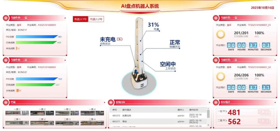 机器人在执行完库房盘点任务后,系统可生成盘点报告,库房管理人员可查看机器人执行的任务清单,也可查询盘点异常的原因。通过创建机器人信息,可以控制机器人的执行任务,并在系统后台监控盘点机器人的电池电量、工作异常等信息,对盘点机器人状态了如指掌。