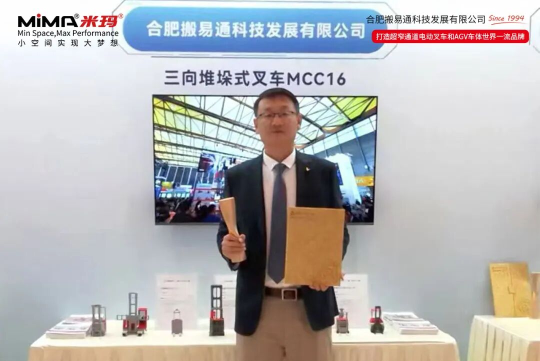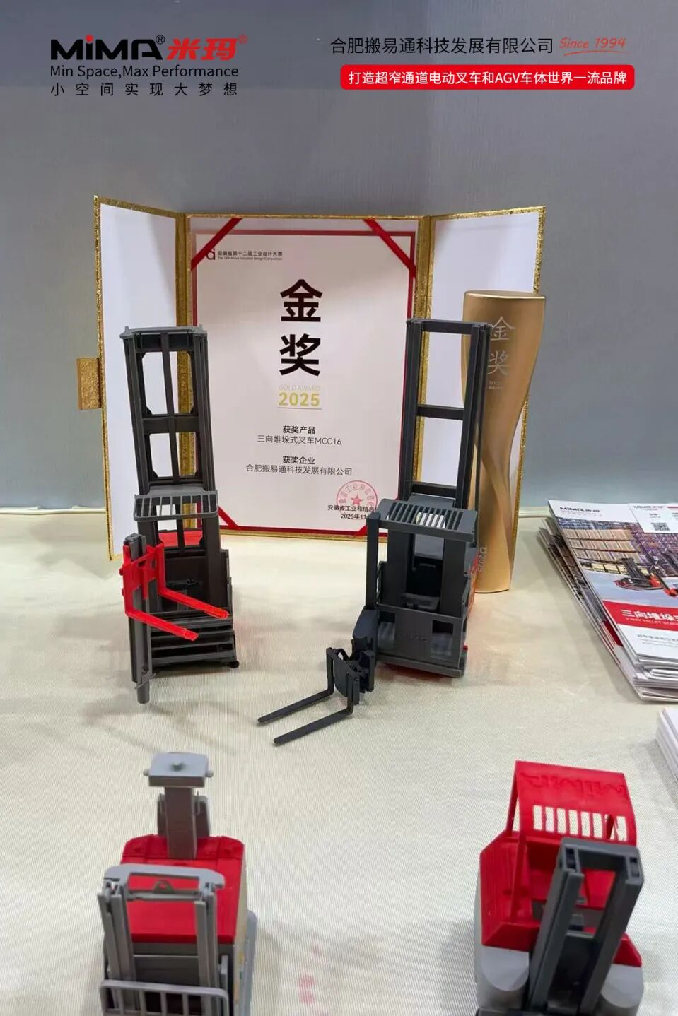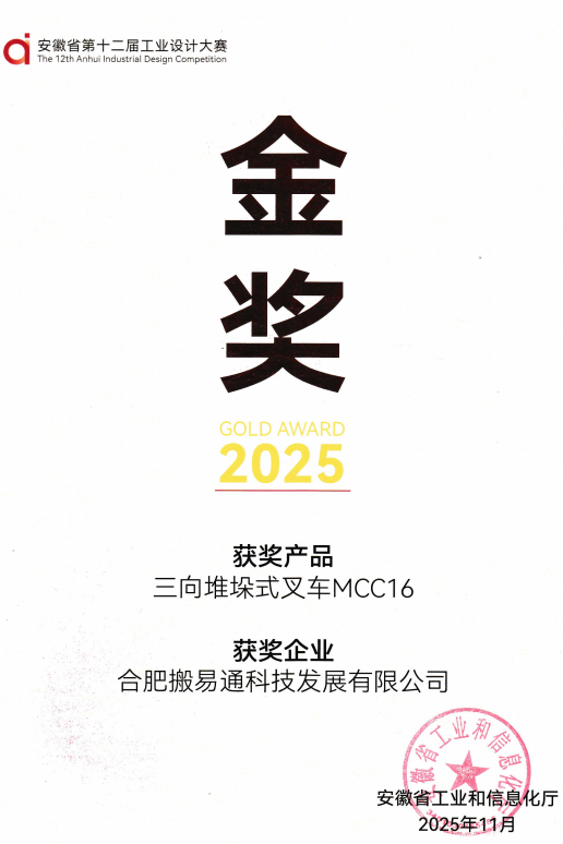 11 月 27 日上午,安徽省第十二届工业设计大赛颁奖大会暨展览展示活动在合肥丰大国际大酒店隆重举行,备受关注的大赛获奖名单也同步揭晓。合肥搬易通科技发展有限公司自主研发的人上型三向堆垛式叉车 MCC16 凭借卓越的创新设计、硬核的产品性能与广泛的应用价值,从众多参赛作品中脱颖而出,成功摘得金奖!这一荣誉不仅是对产品设计的高度认可,更是对公司三十余年深耕电动叉车领域创新实力的有力印证。