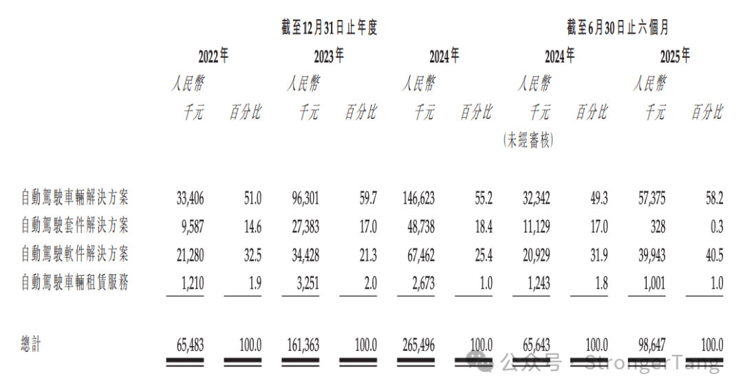 为车辆制造商提供L2+至L4级的自动驾驶软硬件套件,支持客户车辆实现自动驾驶功能。不过,该业务在2025年上半年因订单节奏调整,营收同比大幅下降97.1%,占比降至0.3%,但驭势科技表示,2025年6月30日后及截至最后可行日期,已获得30000套自动驾驶套件的新订单,预期其中10000套将于2025年内交付。