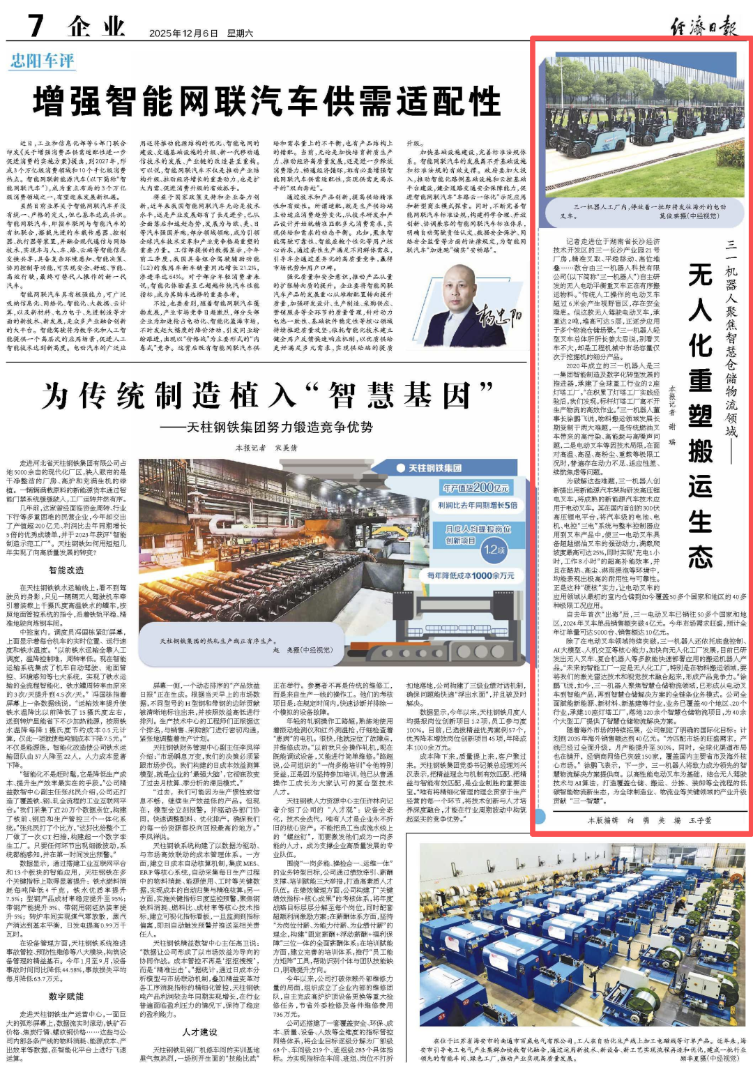 除了在电动叉车领域持续突破,三一机器人还依托底盘控制、AI大模型、人机交互等核心能力,加快向无人化工厂发展,目前已研发出无人叉车、复合机器人等多款能快速部署应用的搬运机器人产品。“未来的智能工厂一定是无人化工厂,特别是在物料搬运领域,要将我们的激光雷达技术和视觉技术融合起来,形成产品竞争力。”徐鹏飞说,如今,三一机器人聚焦智慧仓储物流领域,已形成从电动叉车到智能产品,再到智慧仓储解决方案的全链条业务模式。公司全面赋能新能源、新材料、新基建等行业,业务已覆盖40个地区、20个行业,承建10座灯塔工厂,落地120余个智慧仓储物流项目,为40余个大型工厂提供了智慧仓储物流解决方案。