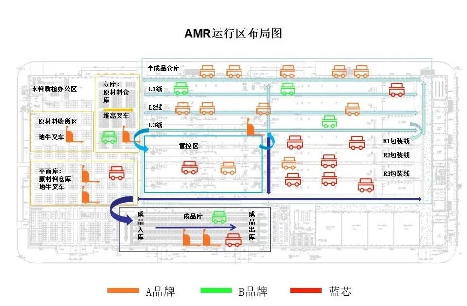 L公司生产物流体系已初步实现自动化,部署了来自不同厂商的自动化设备,包括A品牌的7台潜伏AMR、7台无人叉车和4台辊筒AMR,以及B品牌的5台潜伏AMR。这些设备在执行原材料、