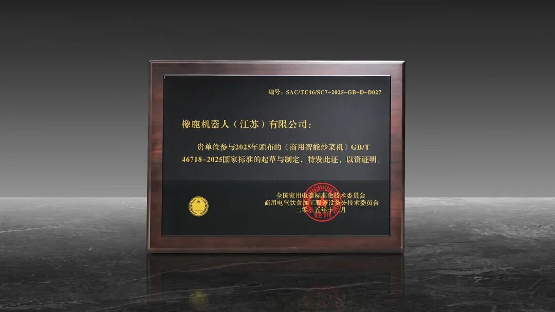 近日,国家市场监督管理总局、国家标准化管理委员会,正式发布了GB/T 46718-2025《商用智能炒菜机》国家标准。作为全球AI炒菜机器人领域的领军者,橡鹿机器人应邀深度参与此项标准的起草与制定工作。