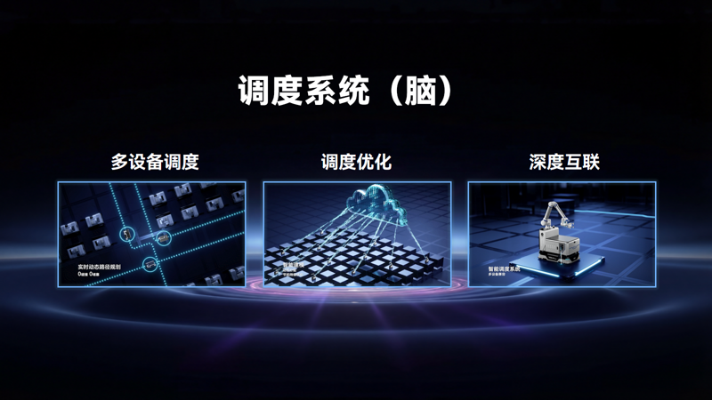 智能协同调度系统(脑): 作为“中央神经枢纽”,该调度系统支持多品类、多品牌设备接入,具备交通管制与流量优化能力,并能与MES、WMS、PLC等上层系统深度互联。