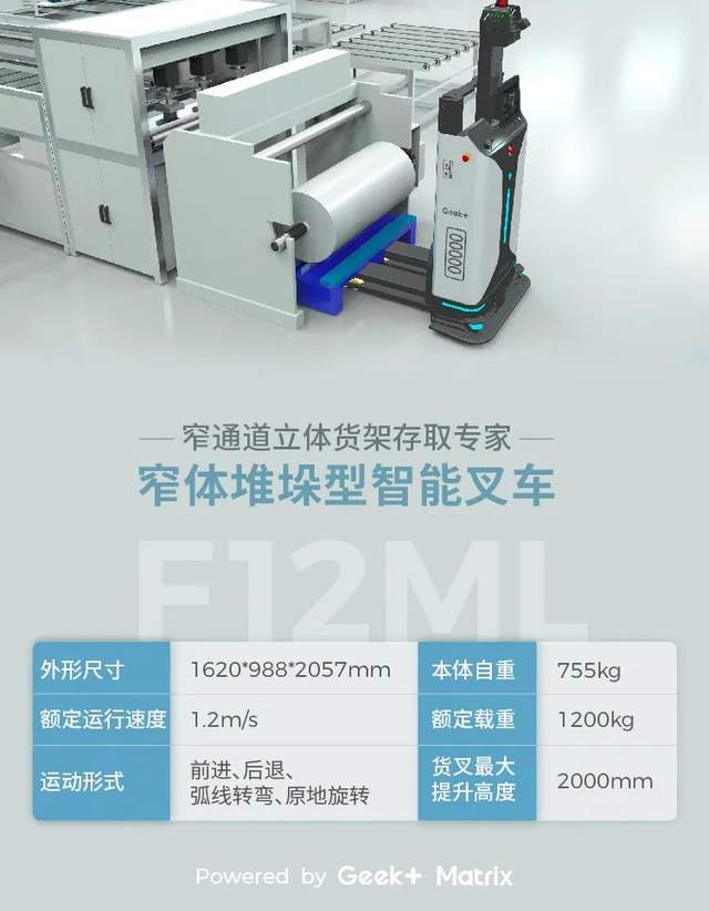 一体化机身结构设计,机身更窄更轻薄,转弯半径更小,可在工厂内的狭窄通道灵活行走。